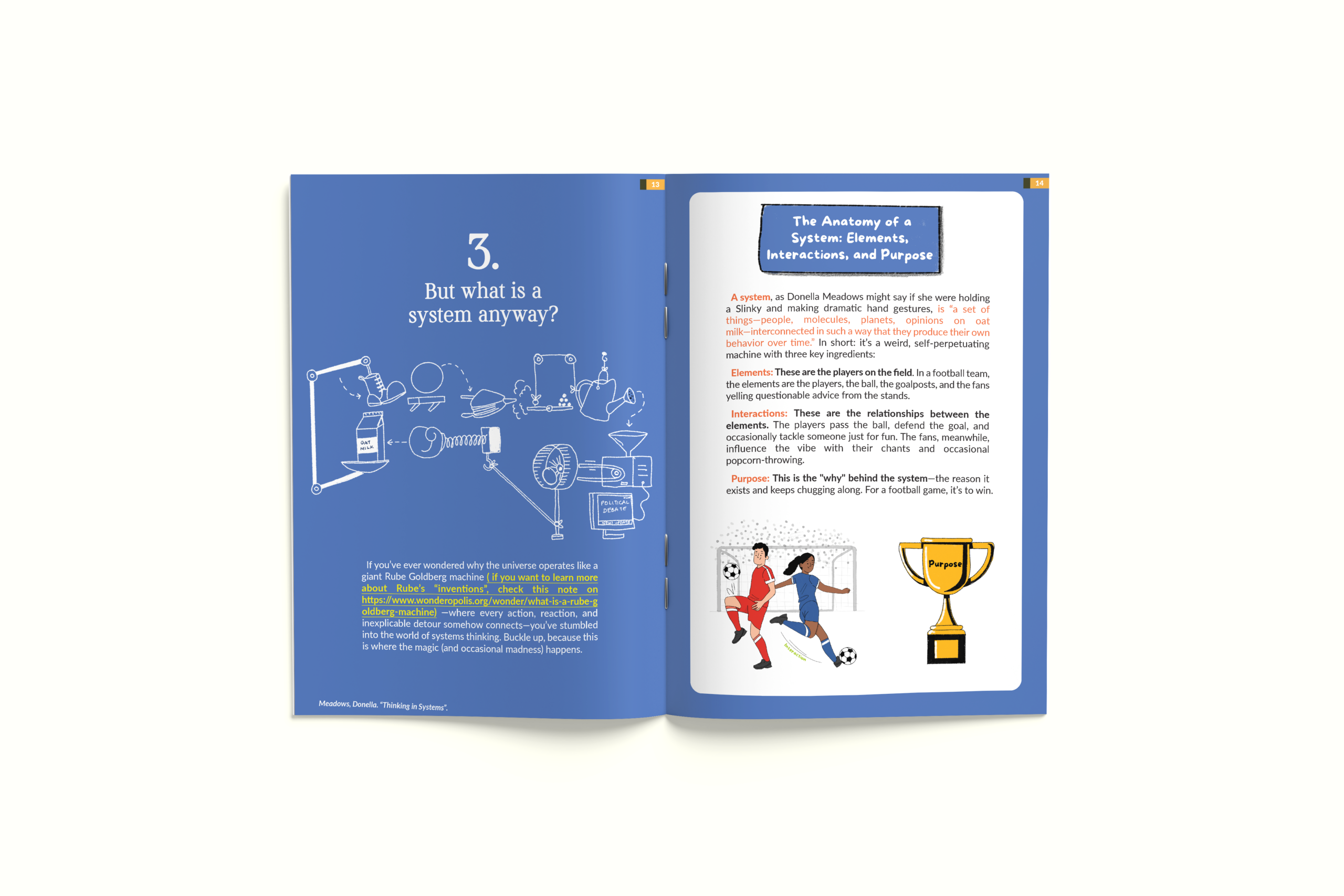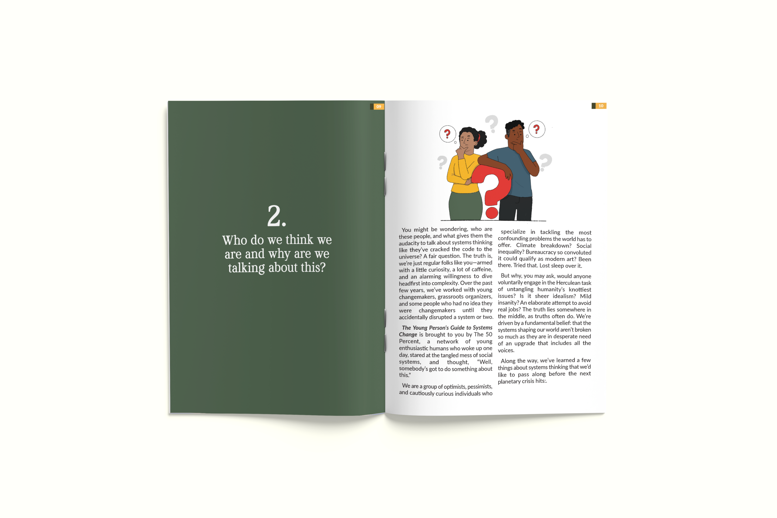 For The 50 Percent, the Club of Rome's youth-led initiative, I designed and illustrated the complete Young Person's Guide to System Change, a free digital handbook that demystifies systems thinking and equips young people worldwide (with strong roots in hubs like Nairobi) to become effective agents of transformation.