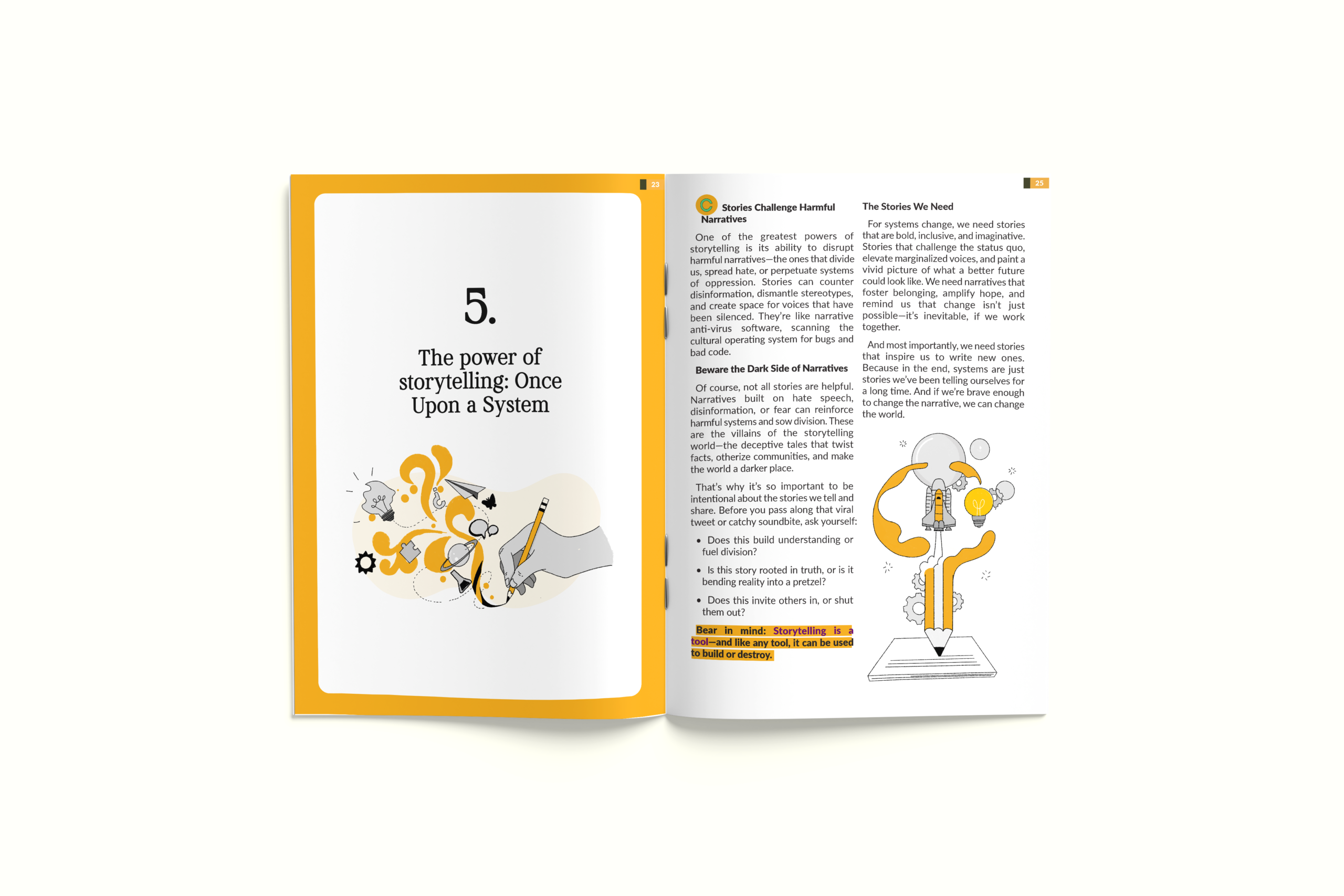 This project was full creative ownership: crafting the cover illustration that captures energy, connection, and possibility; building an inviting, readable digital layout optimized for online/PDF access and creating custom inner-page illustrations that bring the content to life, turning dense topics like systems mapping, empathy across divides, storytelling for impact, and virtuous citizenship into visuals that resonate emotionally and culturally with youth.